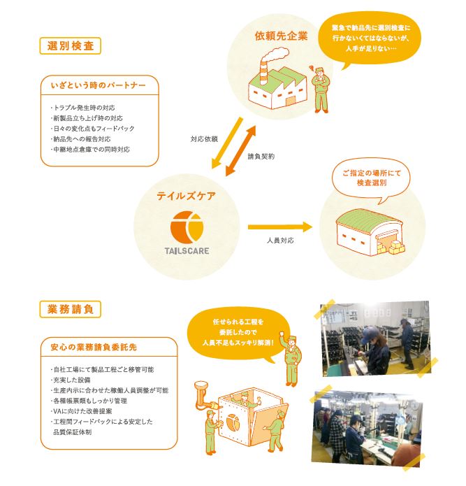 請負事業 請負事業 ■アウトソーシング 現場での作業を一括で請負。 どんな職種でもお気軽にご相談ください。 一つの仕事を一括してお任せいただけます。そこで働く人材雇用、商品の受注や発注、組立作業、流通まで、責任をもってテイルズケアがお引き受けいたします。
